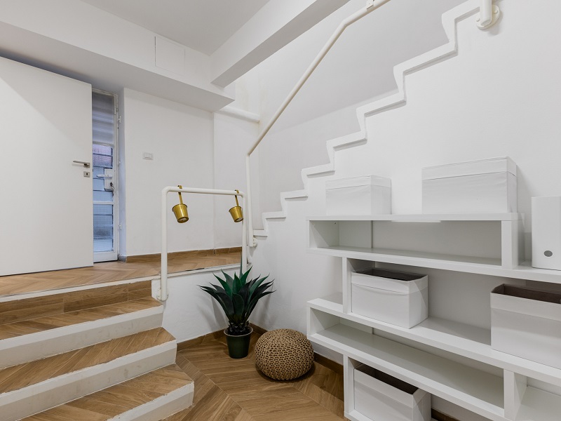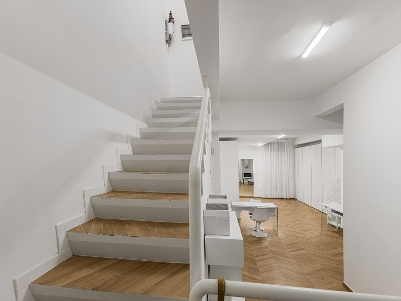 Una scala interna conduce al livello inferiore, dove si trova un ambiente multifunzionale dalle finiture raffinate e con soffitti alti oltre 3 metri.