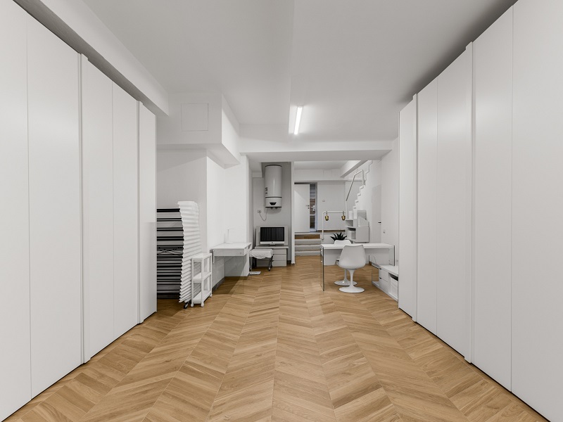 Questo spazio include armadiature su misura, un bagno finestrato con vasca e un ripostiglio, e può essere utilizzato come studio, laboratorio, sala hobby o anche per attività commerciali, grazie al secondo ingresso collegato al cortile interno, dove è possibile effettuare carico e scarico temporanei con l’auto.