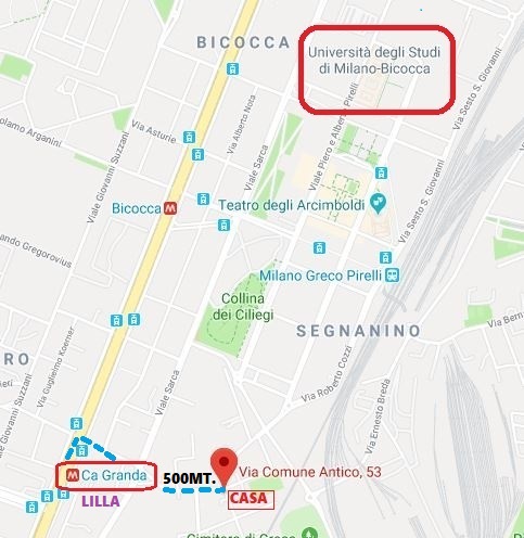 Nelle immediate vicinanze DELL’UNIVERSITA BICOCCA a 500 metri dalla metropolitana MM5 LILLA FERMATA “CA GRANDA”, a sole nove fermate da “DUOMO”.