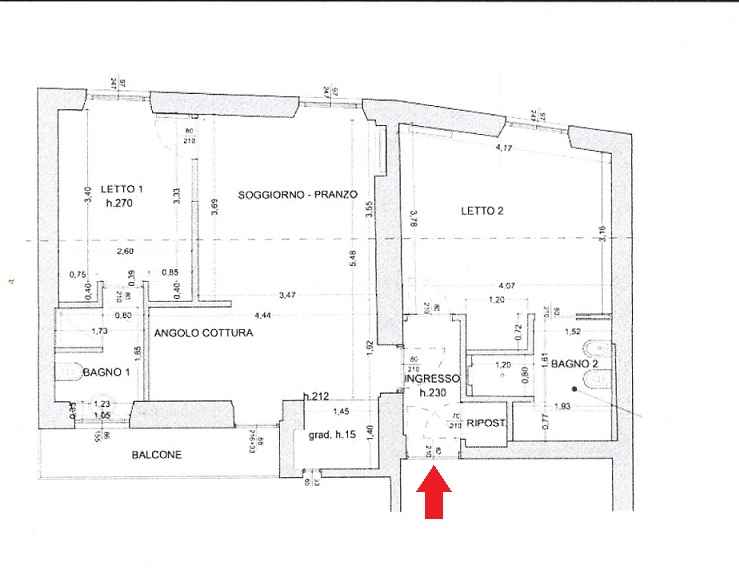 Trilocale con ingresso, soggiorno con angolo cottura e balcone, camera matrimoniale con bagno en suite, seconda camera con bagno en suite.