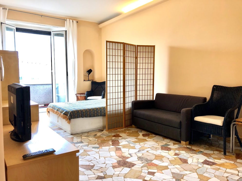 Completa di tutti gli elettrodomestici lavastoviglie inclusa. Spaziosa camera matrimoniale climatizzata con accesso al secondo balcone.