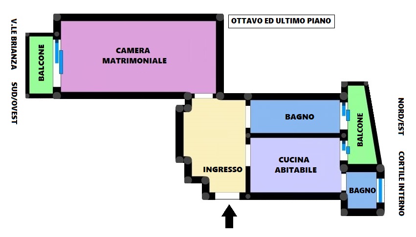 AL PIANO OTTAVO ED ULTIMO CON DOPPIA ESPOSIZIONE. SILENZIOSO E LUMINOSO. Ampio ingresso, cucina abitabile con accesso al primo balcone.