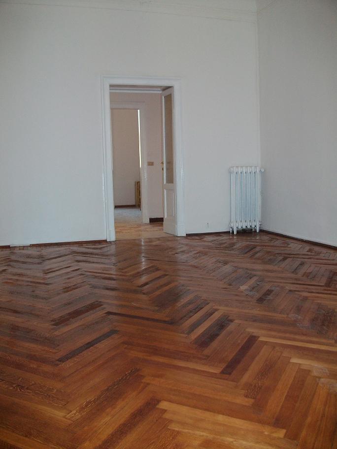 AL PIANO SECONDO CON DOPPIA ESPOSIZIONE e molto silenzioso. Ingresso, AMPIO SOGGIORNO/ TERZA CAMERA, cucina abitabile con balcone arredata e con lavastoviglie, due camere matrimoniali di cui una completa di armadiatura a ponte, un bagno finestrato con vasca e lavatrice e completa l’unita’ la cantina. Altezza soffitti 3,75 metri.