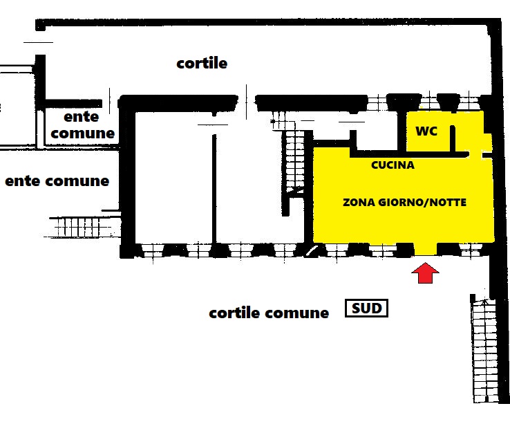 In contesto d’epoca di alto pregio, al piano terra interno alla corte (NO STRADA) esposto a SUD. Ingresso su zona giorno/notte con cucina a vista, disimpegno finestrato e bagno finestrato con box doccia.