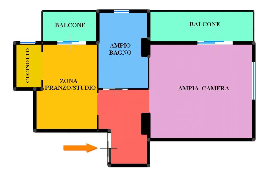 Ingresso su disimpegno, ampia camera CLIMATIZZATA con divano letto, zona pranzo/studio, cucinotto, grande bagno finestrato con vasca e lavatrice, DUE BALCONI e CANTINA. Il tutto perfettamente ristrutturato, arredato e corredato.