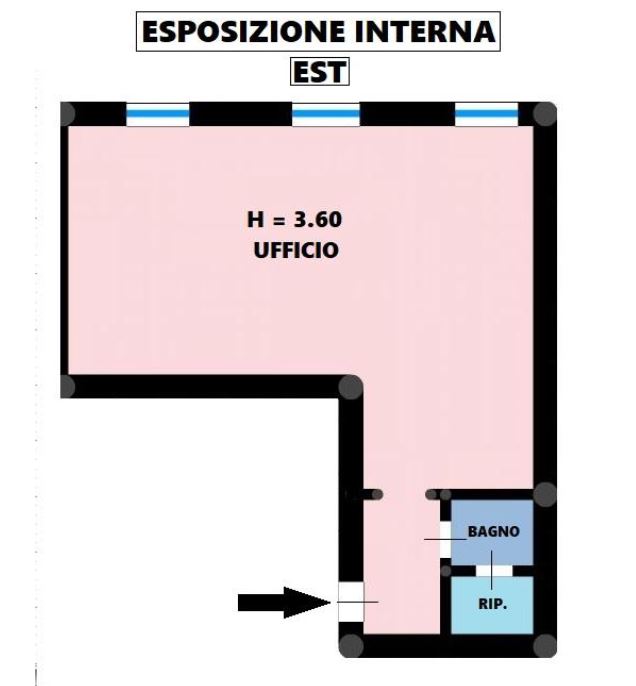 Ingresso, ampio locale con TRE finestre, bagno e ripostiglio. Riscaldamento centralizzato.