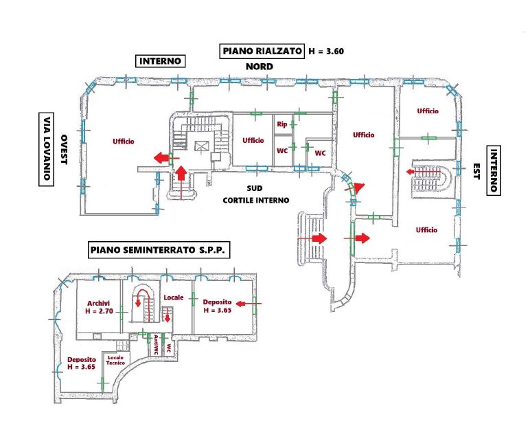 Cinque locali con doppi servizi. Altezza soffitti 3,60 metri. Ufficio collegato internamente da ampia scala al DEPOSITO/ARCHIVIO al piano seminterrato di 145 mq. S.p.p. composto da quattro locali e servizio.