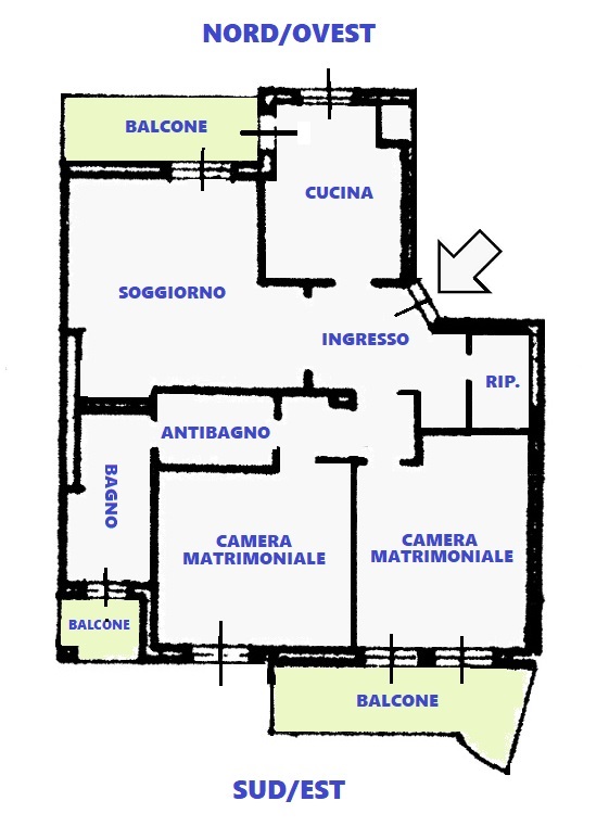 Ingresso, soggiorno con accesso al primo balcone, cucina abitabile con accesso allo stesso balcone, due camere matrimoniali di cui una con accesso al secondo balcone, ampio bagno finestrato con accesso al terzo balconcino, ripostiglio e CANTINA PERTINENZIALE.