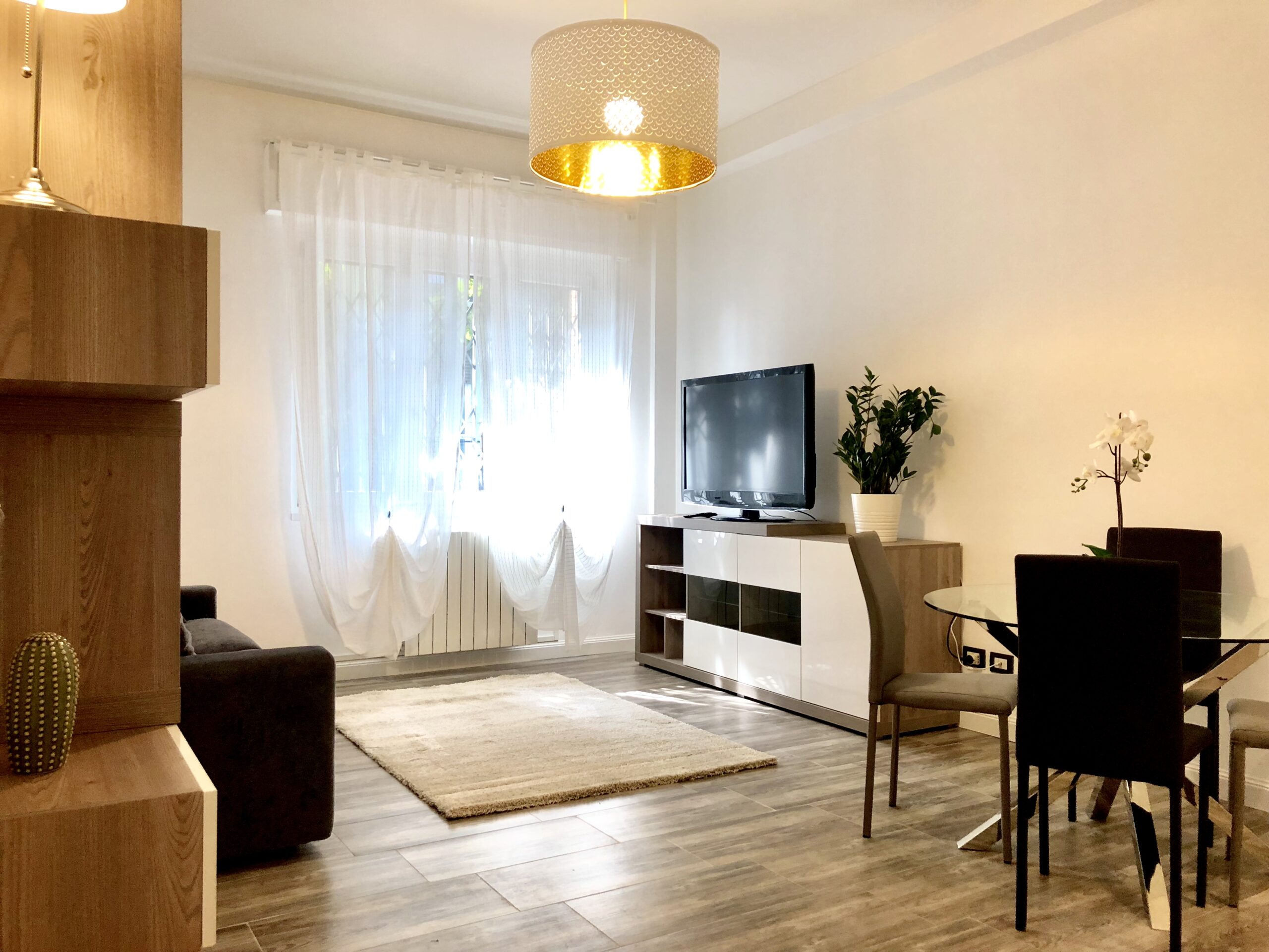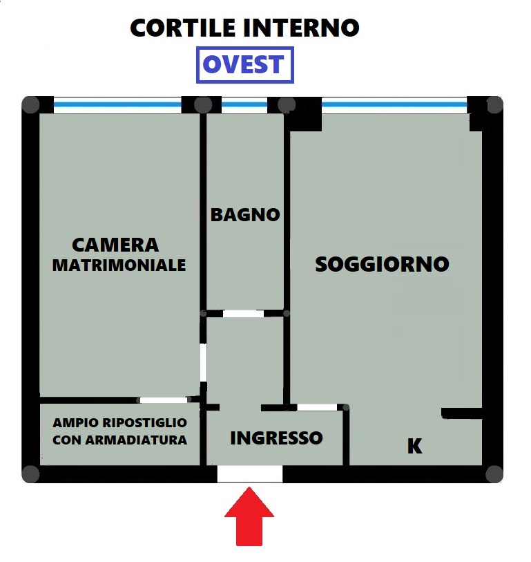 In edificio fine anni ‘50. Piano rialzato con esposizione interna (NO STRADA) ad OVEST. Ingresso, soggiorno con cucina a vista totalmente attrezzata, lavastoviglie inclusa, camera da letto matrimoniale, cabina armadio con armadiatura, disimpegno e bagno finestrato con doccia.