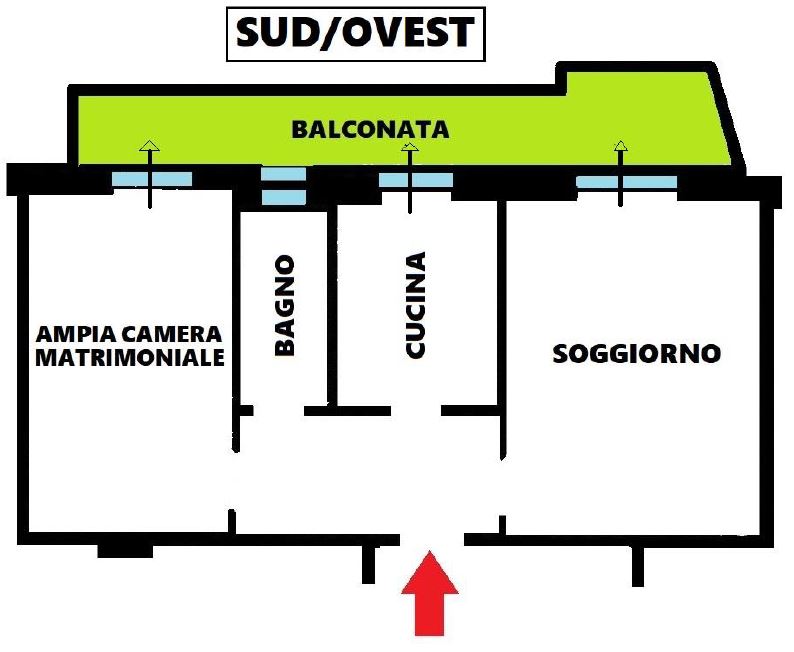 ESPOSTO A SUD/OVEST. Ingresso, soggiorno, cucina abitabile, ampia camera matrimoniale, bagno finestrato e BALCONATA con accesso dal soggiorno, cucina e camera.